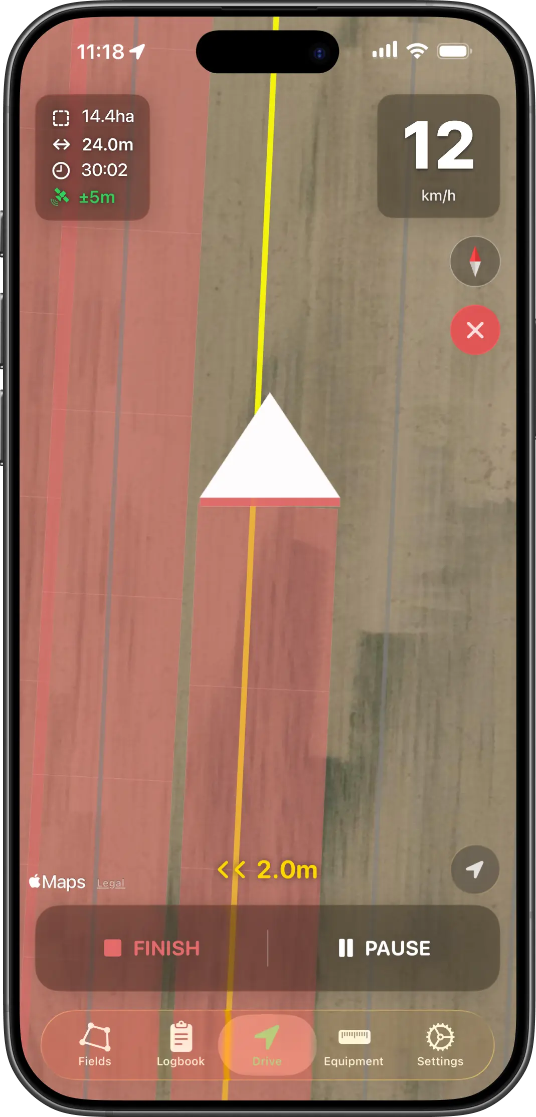 Set your first pass, lock in the line, and let the app show the next run at your working width. It gives you a clear visual guide without overcomplicating the screen.